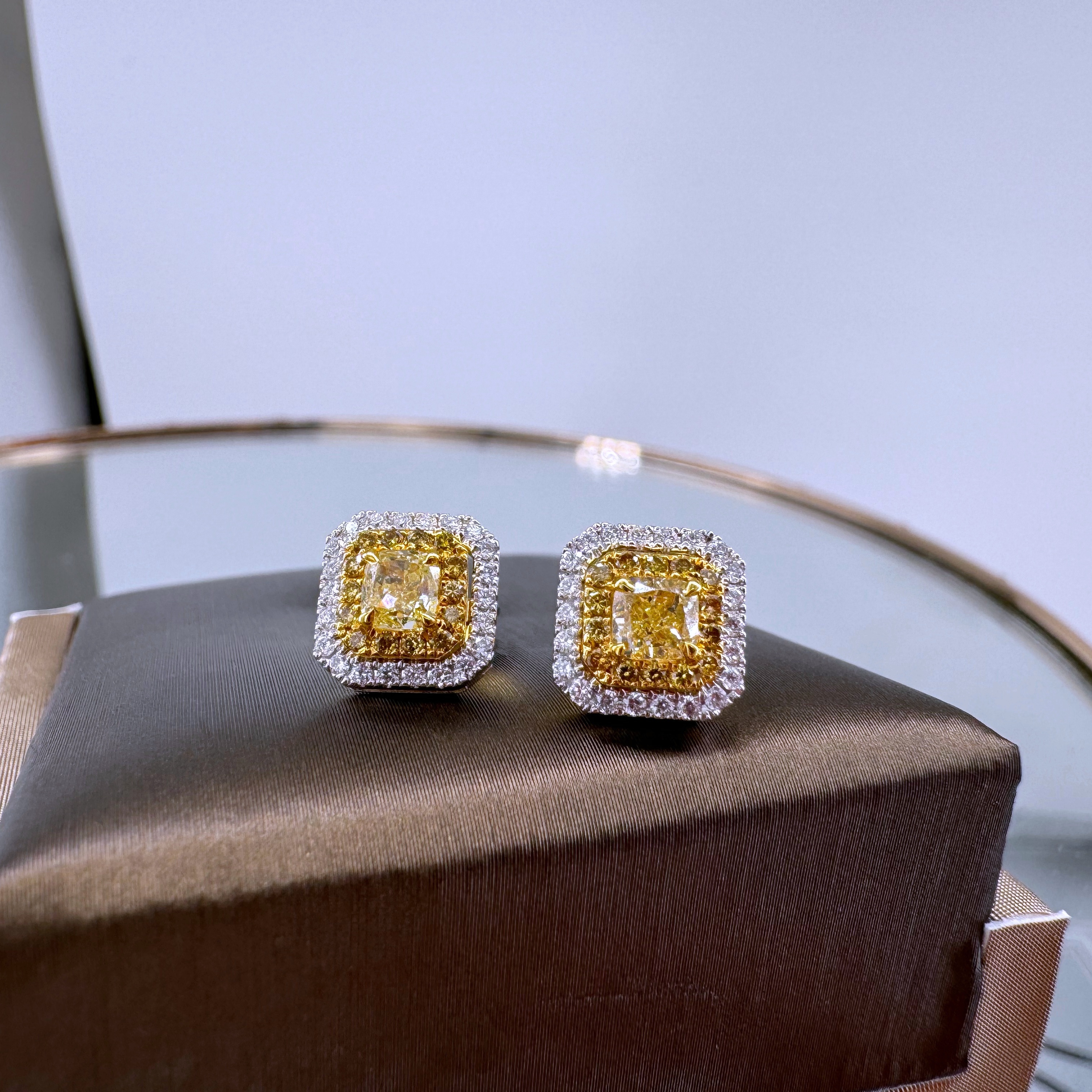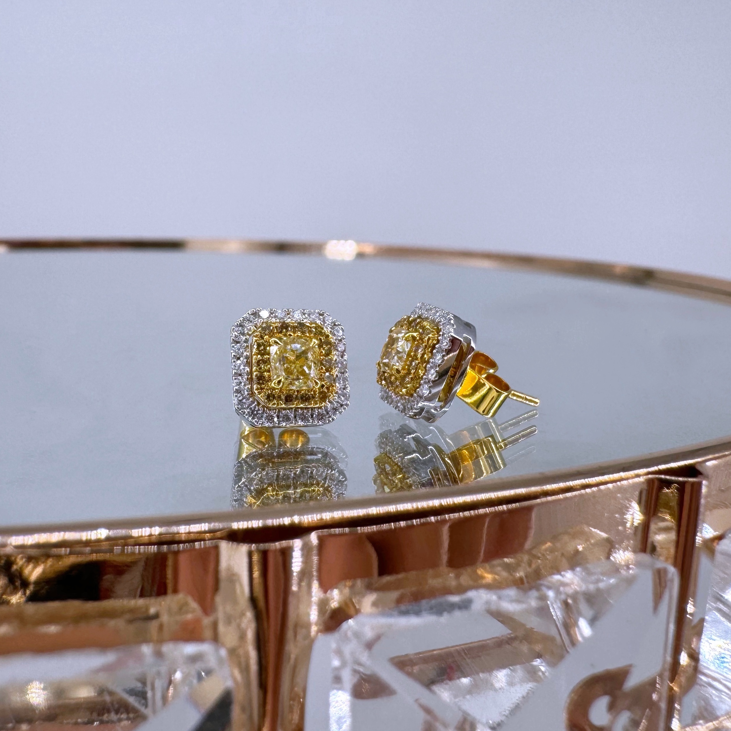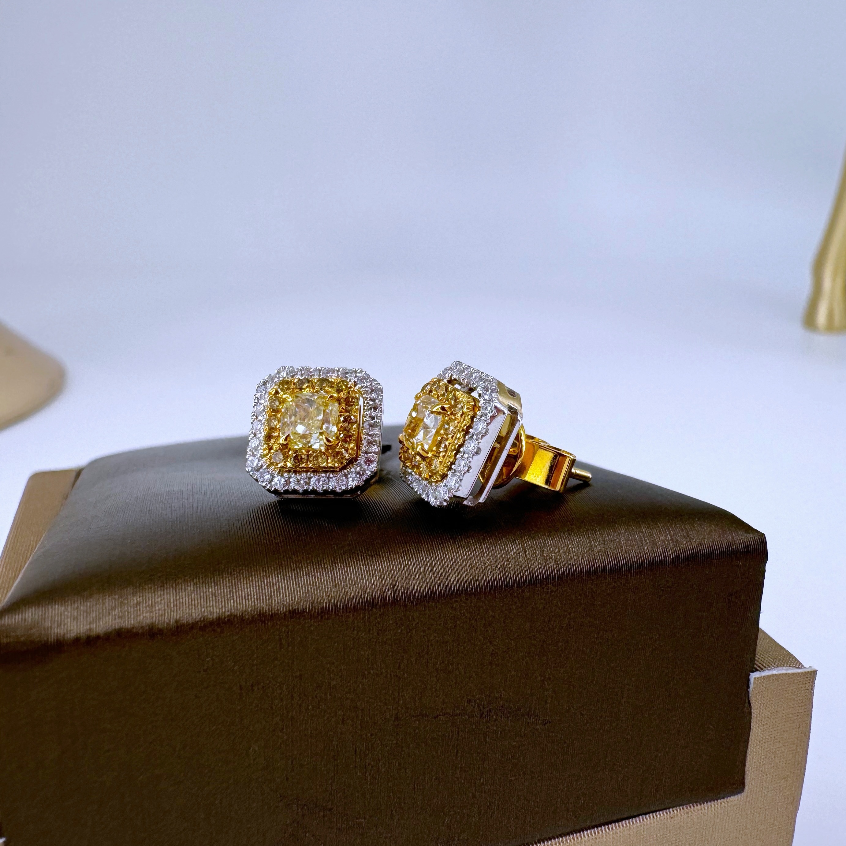 新款750分色金鑲天然黃色鑽石襯石耳環壹對(包鑲連托)